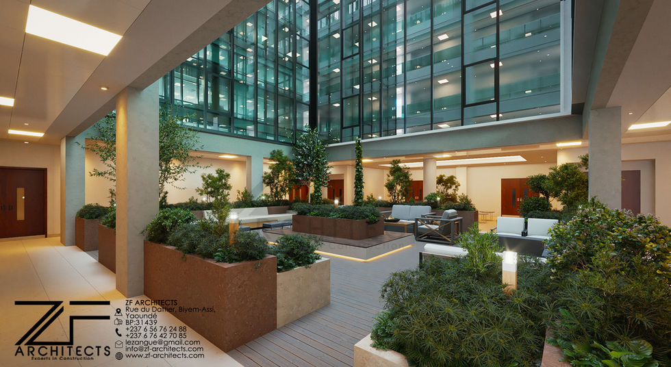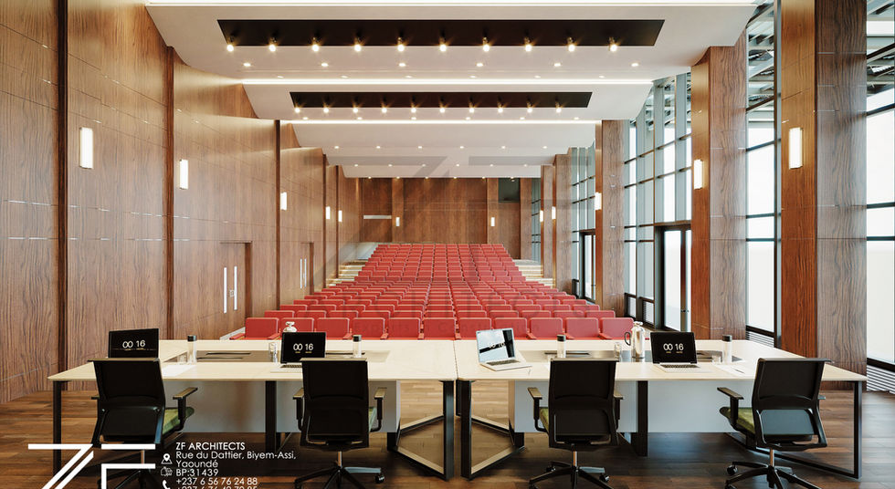 - Des espaces d'accueil et de vie au RDC : Hall principal, salles de conférence modulables, infirmerie, patios et espaces verts.